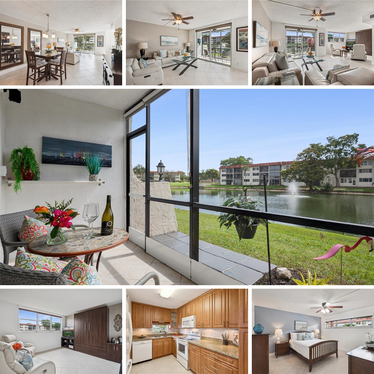 Turn key condo with stunning Golf Couse & Lake views. Within a secure gated community, enjoy the breathtaking long lake views and fountains from your screened terrace in this bright and beautifully designed turnkey condo, perfectly situated on a scenic par-3-golf course .This well-appointed 2/2 home features a modern designer kitchen with a convenient lunch granite counter and stools, allowing you to take in picturesque views from the moment you step thought the front door , spacious second bedroom with a murphy bed for flexible use ,elegant Livingroom with a high quality Italian leather couch, hurricane proof patio door for peace of mind in the Livingroom, title throughout for stylish finish, parking right in front your door. Live the resort life with free PGA golf and Par 3, Rec lease fully paid, 7 pools , 14 tennis courts, 6 Pickel Ball courts, multi level theater , gym ,restaurant, and much more.